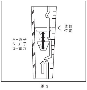 當升力S與浮力A之和等于浮子自身重力G時,浮子處于平衡,穩定在某一高度位置上,錐管上的刻度指示流體的流量值。如下圖(圖3)。